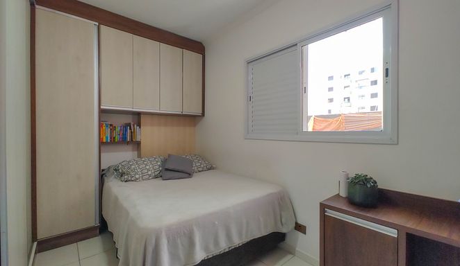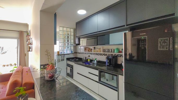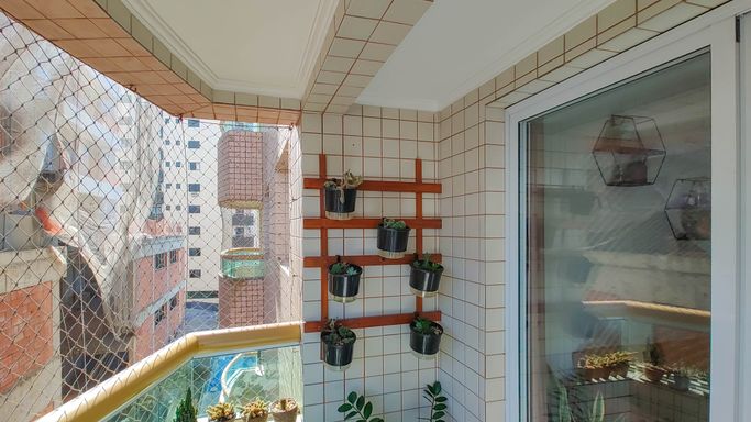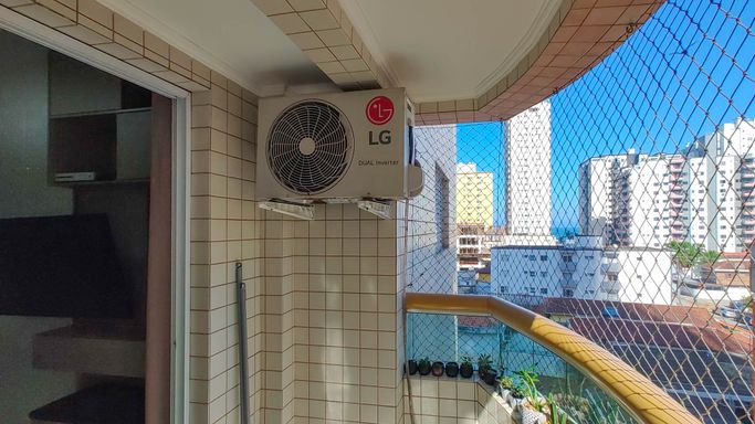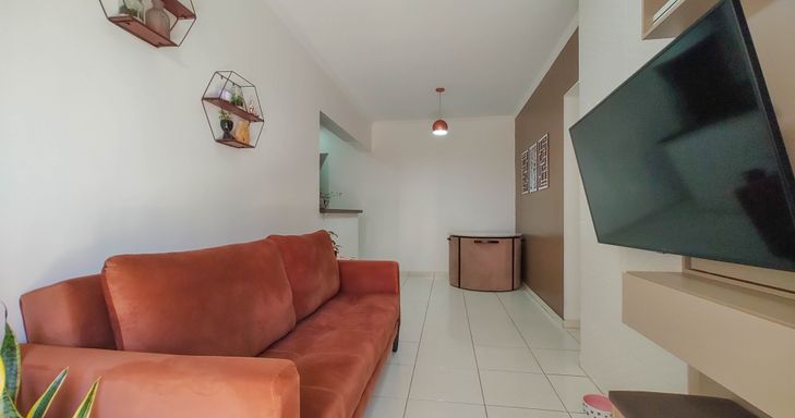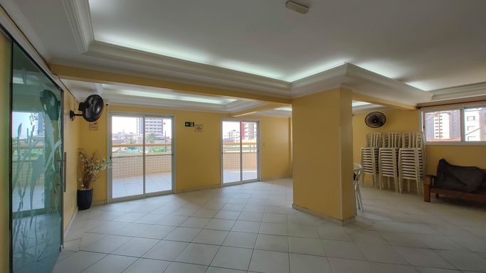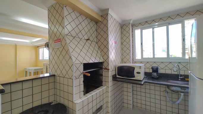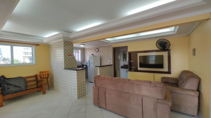 Apartamento semimobiliado com 52m² de área útil, distribuídos em 01 dormitório amplo, sala para dois ambientes, sacada com pequena vista para o mar, cozinha americana, área de serviço, banheiro social e 01 vaga de garagem.